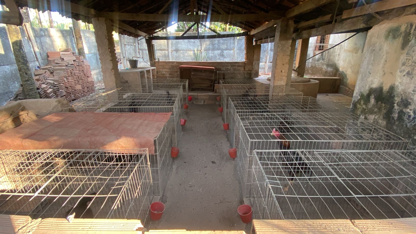 Durante derrubada de um muro, fiscais da prefeitura encontraram 58 galos preparados para briga, além de cães, gatos, tartaruga e suínos em condições precárias