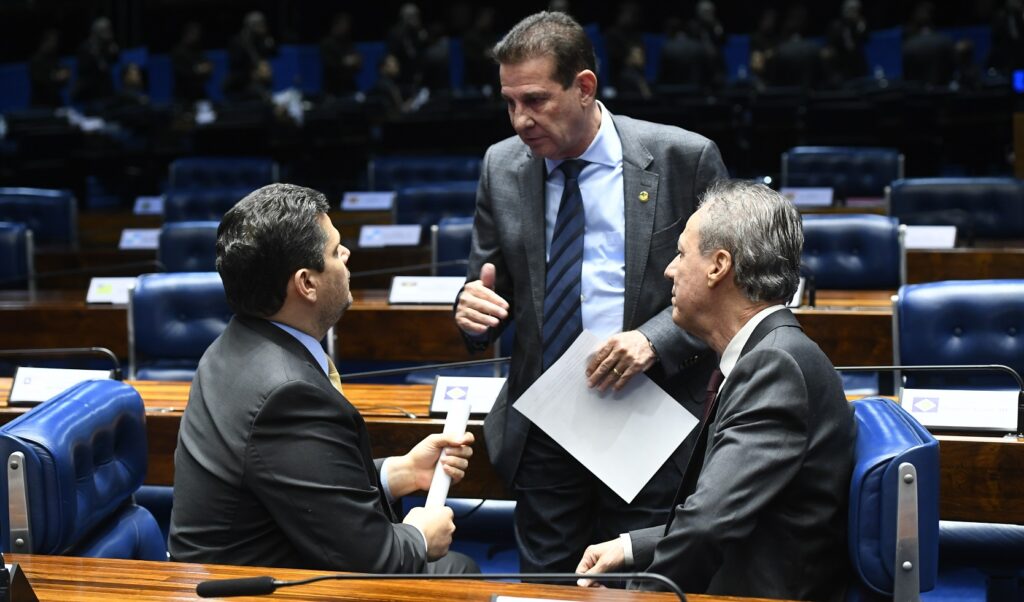Presidente do Senado, Davi Alcolumbre conversa com os senadores Vanderlan Cardoso e Pedro Chaves